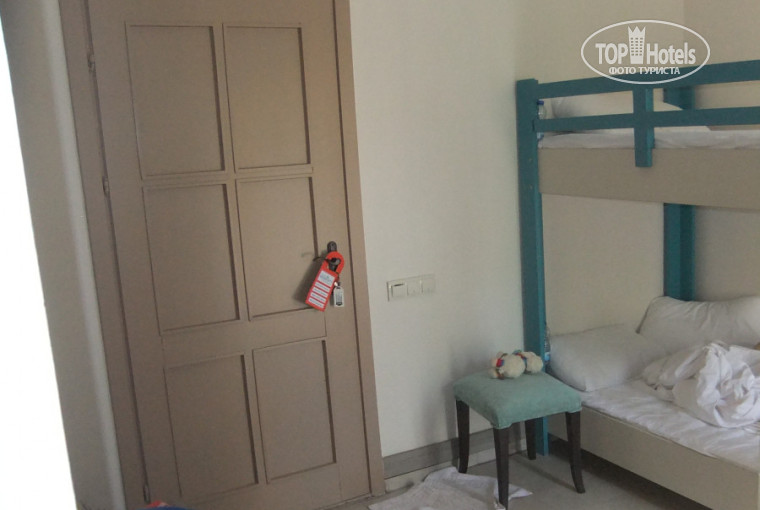 Мне отель понравился только внешне. Ну и по разнообразию питания. Номер был семейный, что подразумевало 2 комнаты и блалкон. всё так и было. Только минус, что номер круглые сутки затенён, холодные кафельные полы и ни коврика ни дорожки. дети босиком..... халатов и тапок нет, хоя в 5 это не нормально. При заселении на балконе вода, было не зайти, ждали пока уберут. В шкафу 6 вешалок и 1 высокая полка,все вещи лежали на кресле весь отпуск. Сушить белье не где- берите верёвки. Дверь в ванную упирается в раковину, что крайне не удобно.