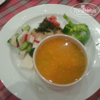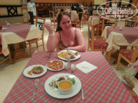 Ресторан. Соответствует 4 звездам. Но - сколько людей - столько мнений. Кому-то он не нравится, кому-то все хорошо, а для меня все отлично. Голодающих я не видел. Ассортимент закусок очень большой, на завтрак вы найдете для себя: яичница, омлет, вареные яйца, сосиски, сладкий картофель, выпечка, блинчики, огурцы, колбаса, сыр, фрукты, йогурт, хлеб в ассортименте, чай, кофе. Свежевыжатый сок здесь есть за отдельную плату. Я обычно беру глазунью с переворотом, Йогурт + Дыня, хлеб, масло, чай. Обед. в последнее время обед дают на гриль баре. Это очень удобно. Поднялся с пляжа 50 ступеней и покушал. Ассортимент на обед: Гриль (мясо, кура), рыба, гарниры картофель, рис, капуста, несколько салатиков, овощи, напитки включая вино и пиво. Откушивать можно вплоть закрытия кухни. Кушайте с расстановкой и с видом на море. Ужин. Его богатство всегда умиляет. Воздержусь поставить оценку повару - скажу по простому - повар молодец. Это всегда искусство из ничего сделать много красивых и вкусных блюд. В процессе отдыха мне удалось пообщаться и подружиться в шеф-поваром данного заведения, обсудить русское меню для русских туристов (что там будет это пока секрет), поговорить о рецептурах и получить комплимент от шефа.
