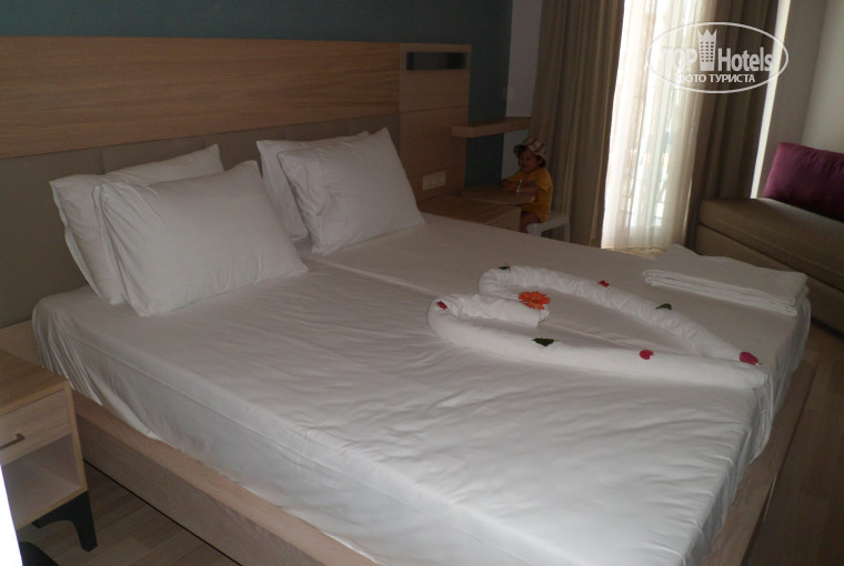 Отдыхала в отеле с 27 мая по 10 июня 2015 года - пишу по свежим воспоминаниям. Ездила одна с 2 детками (8 лет и 2 годика 11 месяцев). Про самолет, трансфер писать не буду - к отелю это не относится. Приехали в отель после 13 часов, моментально заполнили анкету и получили карточку от номера. Шампанское пытались мне дать при заполнении анкеты, но когда у тебя 2 деток - не до этого. Наш номер был на 4 этаже, в 6 корпусе - где находится ресепшн. Номер стандартный, с 2 спальной кроватью и диваном. В ванной было все что можно и нужно - тапки, зубные щетки-пасты, мыло, шампуни-гели-кондиционеры, полотенца для рук, 1 для ног и 2 банных полотенце. Почему акцентирую на полотенцах - они, в том числе, повлияли на оценку 4 за сервис. В номер нас приехало 3 человека (я и 2 детей) - значит и полотенец должно быть 3! Несколько дней ушло на просьбы принести 3-е полотенце - его приносили, а уборщица при уборке забирала. В один день я позвала уборщицу, говорящую только по турецки, взяла одно полотенце и отдала его дочке, второе - сыну, и вопросительно показала жестами - чем мне вытираться? После этого этот вопрос снялся с повестки. При заселении никто из персонала не задался вопросом - где будет спать 3 человек? Сначала мы спали все вместе - кровать большая (у кого есть дети - меня поймут), затем дети стали активно толкаться и я перевела старшую дочку на диван, предварительно в течение дня несколько раз попросив на ресепшн принести постельное белье для дивана. Его на следующий день уборщица благополучно забрала и я уже зная подход к ней - позвала, показала на ребенка и изобразила его спящим на диване. Постель принесли и больше не забирали:). Мыло-шампуни за 2 недели ни разу не пополнялись. После размещения мы сразу побежали обедать.