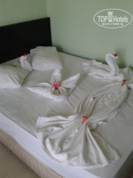 Приехали в отель в 18.30. Засели сразу, денег никто не просил, номер в 4-х этажном корпусе 322 (3 этаж). Номер чистенький, не большой, светлый, вид на горы и частные дома. В номере всё работало: маленький холодильник, маленький телевизор с 5 русскими каналами, кондиционер ( висит прямо над кроватью), в ванной фен. в номере 2 розетки (свободные)- одна в комнате и одна в ванной, если будите заряжать много техники берите тройник.технику заряжать приходилось только ночью, т.к. электричество включалось от брелка на ключе ( отельные хитрости с вставлением пластиковых карточек , картоночек и тд и тп не проходят, только брелок.... кольцо, соединяющее ключ и брелок, запаяно, а второй ключ на ресепшене не дают.. И ванна, и унитаз чистые, но не новые, огромное зеркало перед раковиной -всегда сверкало чистотой. Вода горячая и холодная- постоянно.