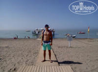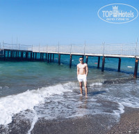 Пляж песчаный и чистый, песок весь просеян и пересыпан. Лежаки все под тентом (навесом). Море чистое. Есть пирс с которого можно попрыгать, что я и делал.