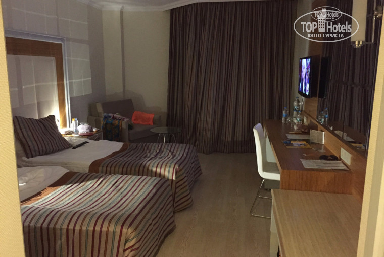 Отдыхали 30.05-08.06.2015г. с подругой. Отдых удался на 5+. Мы остались очень довольны. Номер стандарт на 4 этаже очень приличный, вид у нас был на дорогу. При открытом балконе шумно, но шумоизоляция окон очень хорошая. Ночью ничего не беспокоило. Сантехника в номере отличная, фен тоже. Единственное -на полу ламинат, но это на любителя. Отель выигрывает за счет объединенной территории трех отелей (royal, resort, club), по которой можно гулять и всем пользоваться. К вашим услугам 8 бассейнов (в том числе для совсем маленьких) с горками, корабликами, фонтанами, несколько баров, три бара на пляже и спасательные станции (напротив каждого отеля). Территория ухоженная, много красивых цветов и кустарников. В каждом отеле есть крытый ресторан, открытые веранды, в том числе отдельная для некурящих. Кормёжка отличная, все очень вкусно. Много тушеных овощей во всех сочетаниях, плов, жареный картофель, всегда несколько видов гриля - мясо,кура, пара видов рыбы, целая линия типа "Макдональдс" с картофелем, чикенами и всем набором для составления гамбургеров. Выбор блюд на завтрак, обед и ужин огромный, на любой вкус. Из фруктов всегда были яблоки разные, апельсины, грейпфруты, вечером арбуз или дыня. Красиво оформлен в ресторане детский уголок с маленькими столиками, шариками, детской посудой, своим меню. В отеле отдыхает много иностранцев, поэтому вся обслуга вышкалена, отношение отличное. Все чисто, регулярно меняются скатерти-дорожки. Официанты работают быстро, всегда предложат вино или пиво, за каждыми 4 официантами еще приставлен наблюдать менеджер. Пляж и море-песочек. Море неглубокое, детям и неумеющим плавать взрослым очень удобно и приятно. С лежаками ни у бассейнов, ни на пляже проблем нет. Анимация нормальная. Как всегда есть дартс, игры в бассейне. Вечером во всех трех отелях своя программа, можно посещать любую. Работает наш профессиональный танцевальный коллектив, костюмы и программы просто великолепные! Желающих возили на дискотеки в Аланию. Для детишек тоже своя анимация. В лобби бесплатный WiFi, днем интернет ловит прилично, вечером похуже. Нам все очень понравилось. TT Pegasos Resort -отель, который хочется рекомендовать друзьям и вернуться самому!