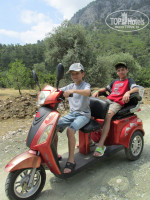Летали на парашюте (тот катер, что стоит на нашем конце пляжа, берет почти в два раза дешевле другого, который в центре пляжа Бельдиби), мальчики сплавлялись на байдарках (масса эмоций!) и, наконец, - мы взяли мопеды напрокат и поехали в каньон Гейнюк! Каньон красивый, конечно, но само катание нам понравилось намного больше. Пять долларов в час – и мой мальчик сел за руль (впервые в жизни!), я села сзади, и мы поехали со скоростью 30 км/час. Это намного приятнее, чем доехать на автобусе, а потом идти пешком по жаре. Говорят, можно ехать в два раза быстрее, но хозяин включил какой-то ограничитель. И это всё, чем он обезопасил свою технику от моих мальчиков :) Мне вообще-то было непонятно, как можно так спокойно относится к поездкам детей, но там все такие спокойные. И проезжающие мимо нас автобусы нам приветливо сигналили. Потрясающе, советую всем.