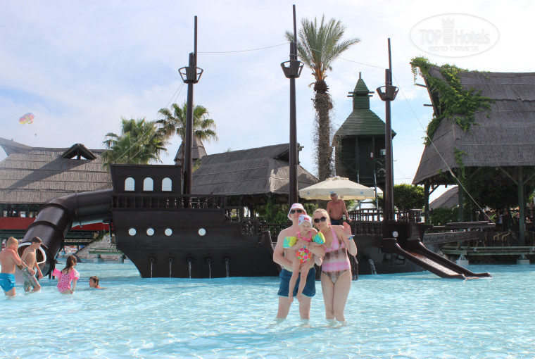 Отдыхали с семье в мае 2013 года. Разместили нас в течение 1,5 часов примерно. Номер был во втором корпусе, хороший двухкомнатый, очень удобный. Правда дали номер на первом этаже (без балкона), что немного расстроило нас, т.к. в заявке специально было указано - номер выше первого этажа! Но было тихо, ничего не мешало отдыхать. Уборка оставляла желать лучшего, раза три на ресепшене делали замечания, их, услышали, приходила уборщица, мыла при нас. Территория прекрасная, ухоженная, чистая, большая. Много зелени, пальм, цветов, очень приятно было там находиться. Для детей - просто сказка. Бассейны с детскими горками, детский буфет все отлично! Анимация для детей - неплохая. Есть большой мини-клуб, но нашему ребенку было всего три года, поэтому она его не посещала. Рестораны хорошие. Питание достойное. Вкусная выпечка, еда всегда свежая, горячая. Фрукты давали сезонные: апельсины, яблоки, клубника, мушмула, арбузы, дыни. Хорошие сладости. Все достаточно разнообразно. Без особых очередей, суеты. Всегда чай, кофе без проблем. Мороженое всегда давали днем в детском буфете, вечером - в главном ресторане. Пляж очень красивый, чистый, песок. Лежаков в мае хватало всегда. Взрослый аквапарк в мае не работал. На территории отеля много магазинов. Не рекомендую даже ездить в TIGER FUL - на витрине все красиво, но на самом деле, качество плохое. Мы с мужем купили мне дубленку и ему куртку. Носим конечно, но за эти деньги в России можно было купить и лучше, ну по крайней мере, не хуже. На куртке зацепил за карман, сразу порвалась - как гнилая тряпочка (дважды), за ремонт отдали 1000 руб. А дубленку присылали после доплаты, пришось несколько раз звонить менеджеру самой, узнавать номер квитанции, тратить деньги. Т.к. сначала откровенно вешали лапшу на уши, что отправили, квитанцию не можем найти, пришлем, перезвоним и т.п. в "Денвере" купила себе кожаную куртку - осталась довольна (цена/качество соответствуют). Но это мое субъективное мнение. Из отеля сами съездили в Сиде на развалины старого города. Лучше поехать с гидом. И ездили в дельфинарий (не советую) - т.к. просто сбор денег. Шоу не поставлено, просто отдельные короткие номера делают животные. Не интересно. В России были на шоу в Краснодарском крае - в пос. Архипоосиповка - вот это было крутое шоу. Впечатление осталось по сей день! В целом: Отель очень хороший! Советую ехать с детьми! Спальные корпуса отдельно стоят, не мешает никакая анимация, ни дети в бассейне. Вид из номеров, в основном, на парковую зону.