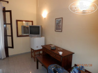В отеле были около 12 часов. Заселили сразу. Дали сначала ключи от 2 номеров в 7 корпусе, я уточнила, не новый ли это корпус (здесь, на Топхотелсе, писали, что там лучше не заселяться), и что мы там жить не хотим. Дали ключи от 1 корпуса, сказали, что у нас ground floor, а нам дают в 7 корпусе 2-й этаж, ну в 1-м будет только первый. Решили посмотреть оба. Номера в 7 корпусе обычные, единственное, душ - просто дырка в полу без всяких заграждений и занавесок, балкон большой, вид на высохшую лужайку и оливковую рощицу, где-то вдалеке море виднеется. Подруги поначалу изъявили желание остаться: все же второй этаж - не первый, да и не так уж тут и плохо. Но раз уж сразу дали вторые ключи - значит, идем смотреть. Зашли мы в свои номера - Бог мой!!! Номера, конечно, постарее. Но 2 номера рядом, 112 и 113, с террасами, и только у этих двух номеров выход в свой садик с апельсиновым деревом и олеандрами и с видом на море. Никаких вторых этажей! Мы остаемся здесь!