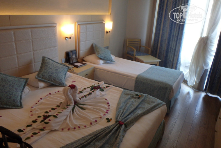 Отель семейный, разместили в главном корпусе (думаю наверно все таки самый оптимальный вариант, всего 3 корпуса), номера маленькие, с 2-мя кроватями, санкомнаты без ванн. В номерах ТВ, мини бар (только вода и сок для детей), система центрального кондиционирования, т.е. отрегулировать температуру самостоятельно нельзя, вы просто включаете его и все, при достижении в номере 24-25 градусов он отключается, а потом опять включается... wi-fi за допплату и за не малую (типа 10УЕ за сутки). Последний был только на рецепшене и в лобби-баре и скорость его была просто ужасная!!!, а вечером когда туда стекался народ погуглиться и поскайпиться - то он просто стоял!!! видимо специально чтобы покупали в номерах (кстати, как оказалось в последующем он был не везде, порекомендовали сначала проверить уровень приема, а потом идти оплачивать иначе можно оплатить, а услугу не получить). При заселении комплиментари от отеля тарелка фруктов и бутылка красного сухого вина 1,5 л. Номер убирали вовремя, а вот качество оставляло желать лучшего, простыни поменяли по моему только один раз, полотенце убирали только явно мокрые, остальные сворачивались и менялись раз в 2-3 дня, "рыльно-мыльные" принадлежности были в виде шампуня, геля для душа, лосьон, шапочка, мыло... На балконе сушилка для купальных принадлежностей, на вид была ржавая, на нее ни чего не вешали.