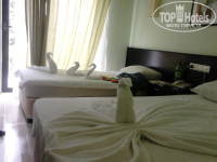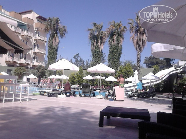 Доехали минут за 30 от аэропорта...Отель красивее, если честно на картинках..Приехали около 12 дня, естественно сказали, что заселять будут после 2, но денег я давать не собиралась, оставили вещи и с ребенком пошли смотреть пляж и море...Хоть и 1 береговая считается, но нужно перейти дорогу и через 3 минуты пляж отеля-камни, крупная галька-ужас! В море нужно заползать и выползать тем, кому жалко 5 долларов на спец.тапочки. Пришли, женщина перед нами сунула деньга за быстрое заселение, и ее повели, и нас бесплатно тоже)) 4 этаж..номер, как номер...все работает, телик ооочень маленький, 2 кровати, кондиционер, ванна , фен, холодильник....белья не было...какие то полотенца белые..Питание...очень много зелени, оливки, маслины...курица была всегда, мясо не давали...одно и тоже целую неделю..один раз была яишница и картошка фри, но ее разбирают махом...различные сухие хлопья, рыба, из фруктов только яблоки и апельсины, сладости тоже очень пропитаны маслом...в принципе-все сытно, голодными не были, из напитков-соки-концентрат, и кофе из машины различное, кола, спрайт...Анимация....детская днем-рисовать, вечером на протяжение всей недели одни и те же песни, для взрослых-дартс, йога, аэробика, и волейбол в воде...горка маленькая...детский бассейн-это вообще что то...на одного дитя...лежаков не хватает ...но все везде чистенько, дружелюбно, тихо.... Наверно, вернусь...