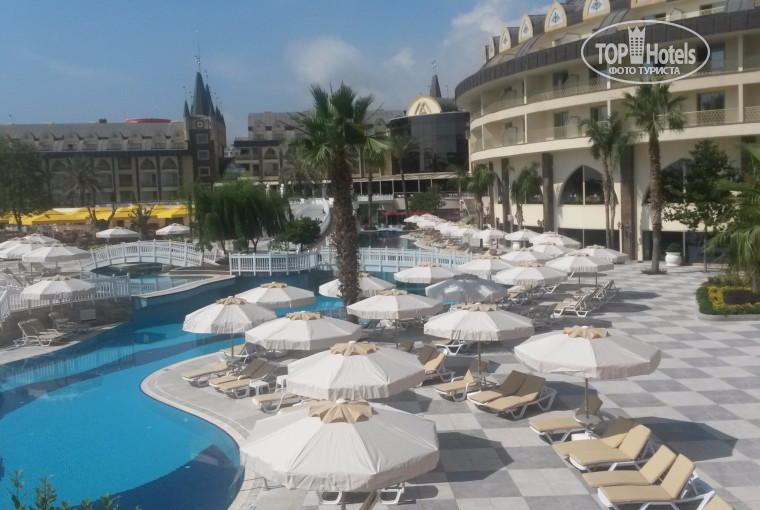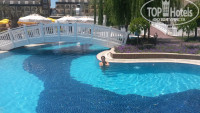 Территория отеля - прекрасный ухоженный парк, со вкусом облагороженный разнообразными зелеными насаждениями, обилием цветов и мест для отдыха, с развитой сферой услуг и развлечений. По всему периметру отеля располагается бассейн, поражающий своими изгибами и кристально чистой водой. Рядом конечно же лежаки и зонтики. В центре парка зона отдыха и концертная площадка. Все перекликается через бассейн множеством белоснежных мостиков, которые соединяют отель с парковой зоной. Имеются еще несколько бассейнов в том числе и детские с горками и другими развлечениями. Монтируется аквапарк. Скоро должен заработать.
