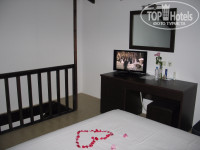 Номер семейный Maisonette (два этажа). На первом этаже две односпальные кровати, тумбочки, санузел с ванной, балкон, а на втором этаже двухспальная кровать, тумбочки, стол, телевизор, холодильник. Корпус недалеко от моря, третий этаж, нас всё устроило. Убирали номер каждый день. Вид из номера был на море и выжженную под окном траву, обнесённую сеткой, похоже не имеющую отношение к отелю.