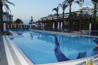 Здравствуйте всем:) Отдыхали в отеле в период с 16 по 28 июня большой семьей) Отдых понравился всем, и ребенку (5 лет) и бабушке с дедушкой, ну и, конечно же, нам с мужем. Приехали в отель мы около 17 часов и сразу же нас заселили, учтя наши пожелания о том, чтобы номера у нас были рядом. Надели браслеты, мы быстро распаковались и отправились прогуляться по территории и поужинать. Территория отеля небольшая, зеленая, ухоженная. На большом зеленом поле для детей установлены аттракционы и батуты, здесь же можно поиграть в футбол или мини-гольф, расположены тренажеры. Пляж песчаный, заход в море - галька, заход не пологий, довольно-таки сразу становится глубоко. Дочка с удовольствием возилась в песка и бегала по воде вдоль берега. На пляже есть большая песочница с навесом. Песок в песочнице прочищают, здесь много игрушек и есть небольшой краник, чтобы дети могла сами себе набрать воды для игр.
