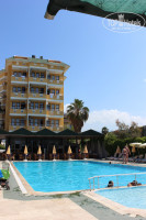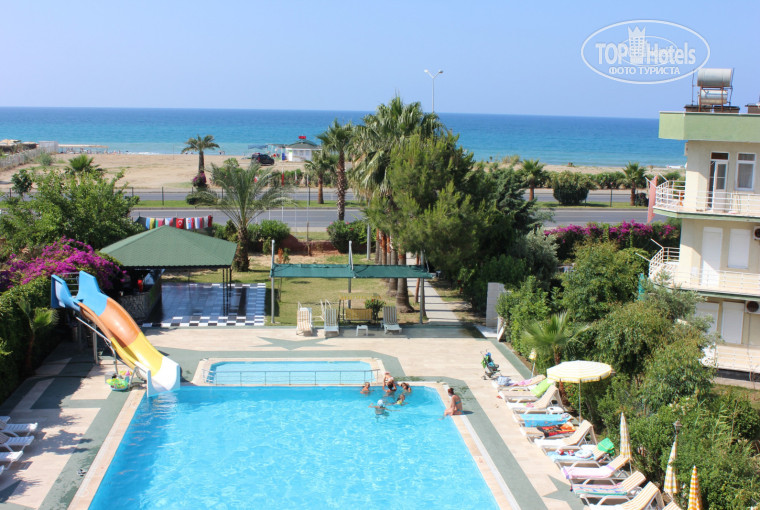 Отдыхали с 9-го по 22-е июня с супругом. До этого отдыхала в 5-ке и 4-ке в Египте, готовилась к худшему. Но первое впечатление было нормальное, территория чистая, номер чистый, имеется кондиционер. Заселили быстро, номер с видом на море. В дальнейшем впечатление испортилось. О еде: рыба скорее всего речная и не очень вкусная, мясо - только одно название (в разных видах), остальная еда на любителя, для детей маленьких есть нечего, за две недели один раз была молочная рисовая каша, а так по утрам хлопья с молоком для всех. Бар: находится в далеке от столиков, надо пройти через бассейн. По приезду дней 5-6 была анимация и диджей, затем все... веселили сами себя и музыку иногда приходилось самим включать нормальную, а не их "завывания". В отеле отсутствовали официанты и бармен, были люди "с улицы", не было ни какой формы (бармен вроде 1 раз майку сменил за две недели). Затем отель начал напоминать проходной двор, стали появляться какие-то люди местные, которые также пили напитки из бара и находились на территории по 2-3 дня (браслетов у них соответственно не было), как кто-то сказал, что вроде это родственники, друзья или знакомые хозяина отеля. Что касаемо моря, то близко идти, но пляж грязный, опять же приходят местные и бросают окурки, банки из под пива, хотя маленькие урны имеются. Если что-то необходимо попросить, то человек на ресепшен делает вид что не понимает, он понимает только что касаемо денег, особенно если ему их дать. Сейф имеется только на ресепшен за 2$ в день, но мы оставляли деньги в чемодане, все оставалось на месте, да и все что лежало на тумбочках ничего не украли, убирали комнату только когда мы этого уже желали, убирали чисто, хорошо. Можно съездить в Аланью на пляж Клеопатра за 3 лиры (остановка у отеля сразу), там пляж чистый, море прозрачное, шезлонги платные, но можно и зонтики взять дешевле.