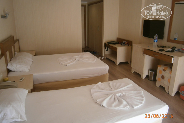 были в отеле с 21.06.15 по 2.07.15 при приезде нам на рецепшене сказали надо заплатить 50 долларов сторговались до 40 долларов. обещали вид на море но в итоге только с боку на море смотрели. ну ладно на это можно с этого отеля посмотреть. там отличная веранда. обслуживание в отеле на веранде на 5 +.. в снеки баре на тебя смотрят и общаются как к идиоту это не только ко мне наблюдал за другими людьми. многие люди жаловались начальнику барменов но в итоге их меняли на 1 -2 дня. анимация почти немецкая. детьми занимаются мелкими вроде хорошо. анимация особенно коммеди клаб когда бабушка в шляпе командует всеми отстой много раз одно и тоже повторяет. понравилось когда боксеры были. за день 2 раза в волейбол поиграть можно, два раза в дротики, один раз танец анимации в бассейне. питание и уборка комнат в отеле на хорошем уровне. питание: с утра только яйца. потом что душа пожелает, понравился обалденный многослойный лаваш. уборка номеров без вопросов. кстати к вопросу о русском языке на рецепшене практически кроме одного Аслана не кто не разговаривает. бармены русский язык знают чуть чуть пальцами показывают.