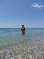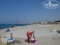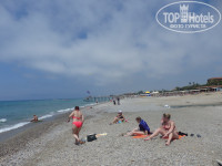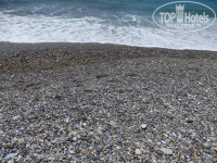 Пляж - первая линия. Свой. Крупногалечный. Сверху завален песком очень тонко. БЕРИТЕ ЗАКРЫТЫЕ ТАПКИ!!!! входить в воду- просто пыточная! Шезлонги старые. Навесы от моря далеко. Все сидят у кромки моря кто на чем. Полотенца пляжные- платно!!!! Очень разочаровало это!!!