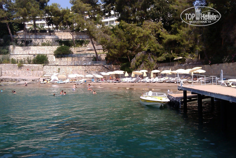 У отеля есть территория, на которой расположен чудесный сад и набережная, которая переходит в волнорез. Поэтому на пляже нет волн и можно спокойно купаться в чистейшем море.