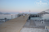 Территория пляжа небольшая, пляж галечный, шезлонги расположены как под зонтиками, так и под большими навесами. Оборудован большой пирс, там тоже шезлонги-зонтики-душ. Детям нравилось с него нырять. Вода чистая, вход в море пологий. Территория оборудована для инвалидов.