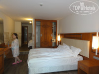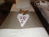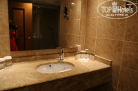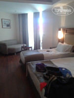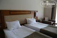 Трансфер до отеля, без проблем, приехали мы в отель около 23 часов. Заполнила анкету, и я попросила номер с видом на бассейн. Нам дали номер с выходом на бассейн, на 0 этаже, №1705. Ну, что тут можно сказать: номер большой, но кафельная плитка на стенах и много чего не доделано (не закрывалась дверь в ванную комнату-она упиралась в косяк, телефон не был подключен, зеркало было разбито, не было пульта от телевизора), я сообщила на ресепшен и попросила поменять номер, мне сказали подойти завтра и номер поменяют. На следующий день, номер поменяли без денег и проблем, за что им большое спасибо. Номер у нас был №1018, с видом на горы и бассейны. Там все было в порядке, только в ванной комнате, вода после принятия душа, стекала на пол. Номер с двуспальной кроватью и полуторной, есть диван, кондиционер, мини бар, набор для кофе и чая. Ванные принадлежности имелись в ассортименте: шампунь, кондиционер для волос, гель для душа, набор для бритья, мыло (обычное, не жидкое), мочалка, ватные диски, пилочка для ногтей, маленькая расческа, два халата и мягкие тапочки, уже позже я нашла нитки и иголку. Должен быть набор для чистки зубов, но его не было. Мы не расстроились по этому поводу.