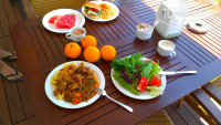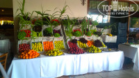 Сразу же, чтобы далее не повторяться скажу, не верьте тем отзывам, где пишут, что еда в ресторане однообразная!!! Не верьте!!! Перед тем как писать отзыв, я специально прочитала последний отзыв, мы отдыхали в одно время с автором того отзыва Натальей, но впечатление, что питались в разных ресторанах!! Еда в отеле волшебная, наслаждаясь пищей, я однажды сказала: «Я хочу поцеловать руки того повара, кто готовил, эту еду!» И это правда. Видно, что, к приготовлению пищи здесь относятся с любовью. Дело в том, что основная составляющая контингента – немцы, более того, насколько нам стало известно – хозяин, тоже немец, так что легко можно сделать вывод – плохой едой Вас не накормят. Здесь была разнообразная еда: овощи – всегда в достатке, зелень свежая от петрушки – до руколы на ваш выбор, фрукты – арбузы, дыня, черешня (редко, но была), яблоки, груши, апельсины, грейпфруты (Скажу секрет, у нас была маленькая пластмассовая соковыжималка для цитрусовых, и мы выжимали сок)) нас пытались поругать, но не все ли равно как мы едим апельсины)) ), на Белой вечеринке преподносили клубнику в шоколаде, а однажды шоколадом полили кусочки арбуза. Вобщем - круто. Мясо разнообразное и тушеное, и на гриле, и рыба (тунец на гриле – это просто бомба, пальчики оближешь), и птица (даже для любителей печень и сердечки птицы тушеные с овощами, вкуснятина), и баранина (ягненок), и телятина в разных видах, ну и соответственно блюд из фарша достаточно. Супы были, детский стол – отдельно, мороженное просто восторг с 13-00 разных видов, десерты вкусные и не только в ресторане, но и в лобби, отдельно ресторан фастфуда – если любите - то Вам туда. Крупы, фасоль стручковая с овощами, кус-кус, макаорны, картофель разных видов, чечевица, конечно же йогурты, джемы, мед, омлет, глазунья, фрукты в сиропе – одним слом есть все, НУЖНО ТОЛЬКО ходить смотреть и выбирать. В этом отеле, если ты не пойдешь к еде, то еда побежит за тобой, она тебя настигнет, и заставит, чтобы ты попробовал))). В ресторане на море такой же выбор. Напитки, как и везде: пиво, вино, виски, ракия, кола, фанта, спрайт, соки из автомата, кофе (вкусный), чаи. Повара – искусные мастера, знающие свое дело. Низкий им поклон и большое спасибо.