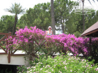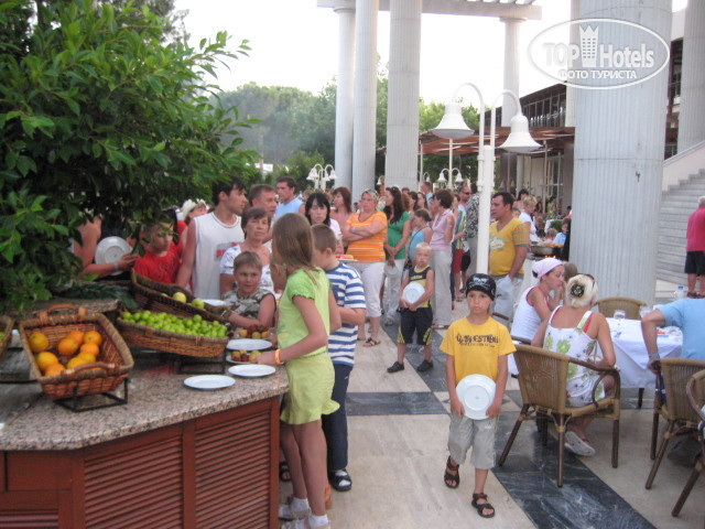Отель очень красивый. Территория зелёная, всё в цветочках, гранаты на деревьях (правда молодые ещё), шелковица, кусты азалии, гибискус, "ёлочки", пальмы, бананы и много-много чего ещё зелёного - красотище, ёжики по территории бегают целыми семьями. НО!: мы ездили в три пары, следовательно - 3 номера. Туалеты не убирали ни разу ни в одном номере - их уборка туалетов заключается в смене туалетной бумаги и полотонец (смена полотенец чаще вызывала сомнение). Унитазы и ванны не мылись ни разу. Причём первые дни пытались с ними бороться, ходили на рецепшен, к дежурному администратору, просили книгу отзывов, которой, как оказалось, у них нет! - вобщем никто ничего так и не мыл (доходило до того, что вместо того чтобы пойти отдыхать на пляж, ждали, когда придут убирать номер, говорили им что и где помыть, на что они отвечали, что нас не понимают).Естественно, оставляли деньги - нам делали красивых лебедей, композиции из цветочков, НО ТУАЛЕТЫ НЕ МЫЛИ. Следующее - БАНЯ! Баня бессплатная - этим, видимо, всё сказано: две сауны БИТКОМ НАБИТЫЕ отдыхающими... чего там только не услышишь, и как "хорошо" кормят, и чем поют, и как "хорошо" в номерах убирают, и как в номерах до кровати "добираются" через муравьиные дороги, в общем, все "довольные". ПРО БАНЮ: в бане для переодевания две комнаты с душем: мужская и женская. В женской: из 3-х душев вода идёт из одного, идёт но не уходит, стоишь в воде, а после меня в него уже очередь (вода не уходит!!!). В бане из общего коридора в женскую комнату дверь не закрывается (стоишь переодеваешься, открывается дверь - кто-то заходит, а по коридору дяденьки гуляют), шкафчики для одежды тоже не закрываются, элементарно лавочек для удобного переодевания нет. А пол!!!, представьте: вода не уходит - на полу чего только нет..., от одних только волос тошнит. Вспоминать баню - бр-р-р-р...Анимация вся на иностранном языке, хотя отдыхающие в отеле в основном русские (по-моему, так 100%)... ПИТАНИЕ: утром ела только блинчики (очень вкусные - а-а-абажаю), в обед - одни арбузы, больше в обед ничего не могла есть (моё впечатление, что обед - это оставшийся вчерашний ужин), на ужин всегда много вкусненького мясо, сама удивляюсь,сколько могла съесть. С фруктами, беда: зелёные арбузы, зелёная кислая алыча, нормальные только апельсины ( но нас ими не удивишь), позже стали давать викторию (это, вообще, отдельная тема). ПРО АРБУЗЫ:стою в очередной раз в обед в очереди - дяденька режит арбузы, подходит моя очередь он говорит:"Финиш", я ему: "Режь, я столько стояла, в конце - концов, ОТЕЛЬ 5 ЗВЁЗД...", НЕ ОТРЕЗАЛ, пришла обиженная за наш стол, наши мужчины пошли, разобрались и принесли красный арбуз - это СЕРВИС???) ПРО ВИКТОРИЮ: однажды давали викторию... Очередь увидите на фотографии... Короче, на весь ОГРОМНЫЙ отель поставили 4 или 6 лотков с викторией. Что там было... В оконцове один лоток перевернули на пол - все ягоды на полу (их и с полу подымали). На следующий день администраторы на раздачу виктории поставили дяденьку, натянули верёвочку (чтоб не создавали толпу, а двигались в доль неё) и дяденька ПО НОРМЕ раздавал ягодки - ЭТО ОТЕЛЬ 5 ЗВЁЗД. Кстати, виктория не вкусная. Многие проще делали: выходили за отель и покупали фрукты там. Ещё прикол, не по-русски (хотя в отеле одни русские) - едят в ресторане до 9-ти что-ли вечера, а пьют в баре после (короче в баре только пьют, там не закусывают - приходилось изощратьс