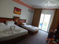 Номер был простой без изысков 344 - выход на задний двор (два спальных места: одно для родителей, одно для ребенка). В номере тв (с достаточным кол-вом русских каналов, есть украинские каналы, канал для жителей казахстана, и зарубежные каналы), чайник (не пользовались), минихолодильник, ванна (душевая без бортика - вся сырость на полу). Персонал на ресепшене русскоговорящий - проблем не было. В номере ежедневно проходила уборка и меняли полотенца (без чаевых), правда в течении недели так и не сменили белье. В номере обычная хорошая мебель - к номеру претензий нет (хотели конечно с видом на море - но ...).