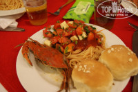 Питание: отвратительное. Нельзя сказать, что выбор скудный, но то, что предлагается, есть невозможно - еда острая (даже в детском уголке), колбасы, сосиски, сыры по вкусу напоминают что угодно, но только не мясные и молочные продукты. Десерты все одинаково безвкусные. Фруктов мало, один раз посчастливилось застать зеленый арбуз, зеленая дыня была каждый день, что радости не приносило. Методом проб и ошибок поняли, что есть можно только то, что готовят на веранде, но так как там каждый день одно и тоже, на 5 день в горло это уже не лезет (утром яичница, оладьи...ребенку рисовая молочная каша и йогурт, не фонтан, но есть можно; обед - картошка фри, макароны в остром соусе, неизвестный бургер, иногда крабы, что я считаю лишь закуской к пиву, но никак не горячее; ужин - те же макароны в остром соусе, котлеты из баранины). Кстати, чтобы попробовать всю эту вкусноту, нужно было отстоять в большой очереди, которая собиралась за 20 минут до открытия ресторана. Также там большая проблема с ложками - 1 на стол, независимо от количества персон. Однажды попросили дополнительную ложку, в ответ недовольное "А зачем?!". Повсюду недовольный наглый персонал, подгоняют на ужин, чтобы быстрее ели и не сидели, потому что за закрытыми дверями стоит толпа отдыхающих, пришедших через 15 минут после открытия ресторана. С понятием "все включено" тоже возникали разногласия с персоналом: напитки выдаются только по 2 в руки, поэтому, чтобы взять на всю компанию, надо идти всем табуном =(. Также напрягали постоянно просящие глаза бармена и недовольство, если им не дашь на чай, чего делать конечно не хотелось. Ресторану и питанию оценка - 2.