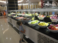 Ну а портит все это великолепие, как обычно, сервис, вернее его отсутствие в отеле на данный момент. Ресторан достаточно большой, плюс еще места на улице. В принципе, даже в разгар турецкого праздника свободный стол всегда можно было найти, пусть и в дальнем конце зала. Но если стол был не накрыт, то ждать можно было вечно, либо просто идти и за руку вести официанта к столу. Когда садишься за стол, то ожидать подхода официанта с вопросом о напитках тоже лучше не стоит. Происходит это в лучшем случае раз в 3 дня. При этом они по 3-4 человека стоят почти рядом с тобой, складывают грязные тарелки, некоторые изображают активную деятельность, но подойти к столику не считают нужным. Выход - ничего не ждать, подходить самому и делать заказ. Можно также подойти за напитком к бару, но тогда ты стоишь и ждешь, пока бармен напитки всем официантам, а потом снизойдет до тебя. Есть, конечно, исключения. Есть в ресторане один уголок, где работают два официанта, которые все делают для гостей, и по напиткам, и с ребенком поиграют, шарик подарят, но там всего 3-4 столика и почти всегда занято. С таким отношением и чаевые давать хочется. Но их коллеги, увы, этого не понимают.