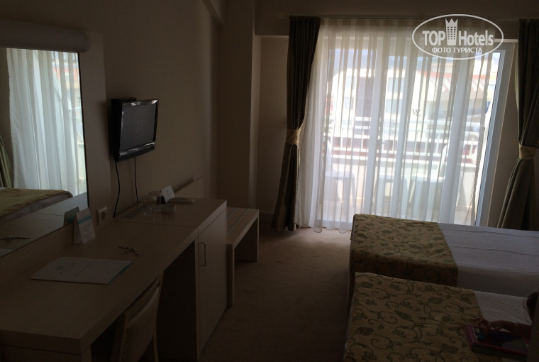 Сейчас отдыхаем в отеле (июль-август 2015) и хочу поделиться впечатлениями. Отдыхали в разных странах в Турции впервые. Отель соответствует классу по мебели и интерьеру, но сервис никуда. Двоих взрослых с ребенком 5 лет заселили в номер для двоих, на ребенка нет ни доп.кровати, ни полотенца и уже сутки не могу допроситься. Кондиционер не работает, спать ночью очень душно, купили вечером фрукты положили в холодильник, а он тоже не работает. Пытаюсь на ресепшене решить это вопрос, пока результата нет. При заселении не дали расписание ресторана и др. заведений отеля, все нужно узнавать самому, что, где и в какое время. Детская анимация очень скромная (были в Египте, там существенно лучше). Питание среднее, можно найти что покушать, но выборы не большой и очереди за всем. Радует море, теплое и чистое. Думаю, что еще в этот отель я бы не вернулась. Да еще совет, будьте готовы, что за все с вас будут наровить получить деньги, не важно, что по путевке уже все вами оплачено. Без $ и шагу к вам не сделают.