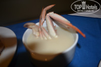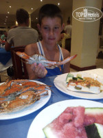 Т.к. мы жили в аква, то соответственно и питались на втором этаже. Честно скажу, больше всего перед поездкой меня страшило именно питание, потому как основные дебаты в отзывах были посвящены именно этой теме. Переживала, а вдруг детям с мужем не чего будет есть или будет не съедобным, а вдруг не куда будет сесть, ведь все столы загажены, еда испорчена….. вот такая картина у меня была в голове. Люди, те кто размышляет отправиться ли в данный отель или нет, если вы дома на завтрак ложками едите черную икру, на обед лобстеров и на ужин, что-нибудь подобное, то вам здесь делать не чего. Все остальные со спокойной душой ВПЕРЕД. Еда вполне нормальная, мясо всегда разного вида и кура, и говядина, и печень, и рыба, были и крабы, и креветки, из гарнира рис есть всегда (я честно говоря только его и ела из гарнира, просто я очень люблю рис, особенно как они его готовят), макароны разного вида, фри, на детском столе детям брали и картофельное пюре, и голубцы, на первое пару видов супа не всегда для меня съедобные, мужу нравились, но я в принципе и дома то не любитель есть первое, для детей молочная лапша бывает часто, на завтрак сын всегда брал себе блинов и пончиков, дочери нравился йогурт, я себе всегда брала омлет, мужу глазунью, на ужин всегда резали либо арбузы либо дыни. Выбор салатов не очень велик, но вполне хватало, мы в основном брали просто отдельно овощи (можно сказать сами собирали себе салат по вкусу). Очередей больших как таковых не было, как многие пугают, даже там, где какое-нибудь блюдо, которое пользуется спросом, на пример арбуз или омлет, или еще что-то, очередь могла скопиться, но она очень быстро двигалась, лишь однажды я стояла в очереди за омлетом где-то мин 10, т.к. у повара закончилось масло и ему долго не несли, а в остальных БОЛЬШИХ очередях больше минуты мы не стояли никогда. Хотя слышала, что на первом этаже с очередями по сложнее, т.к. местный народ в основном питается там, поэтому первый этаж более перегружен. Столы вполне чистые, скатерти нормальные, той прикипевшей к столу грязи, о которой некоторые писали, я не видела, хотя присматривалась. Липкие полы я почуяла только около аппарата с соком, т.к. он достаточно высоко стоит для детей и зачастую они проливают его, а еще на раздаче арбуза, по той же самой причине. За весь отдых дочка пару раз жаловалась на боли в животике, я давала ей смекту, более серьезных лекарств нам не понадобилось, ни рвоты, ни поноса не было. Хотя она и дома так может говорить, чтобы ее не заставляли есть. Подводя итоги, хочется отметить, что я с мужем и наши дети ели все тоже самое, что и все, никто ничем не отравился, мы даже все пили тот ужасный сок ЮПИ, вполне нормальный и если его они разводят как многие пишут своей водой из-под крана, то значит у всей нашей семьи и тех друзей с кем мы там познакомились и весь отдых провели вместе, просто непробиваемые желудки.