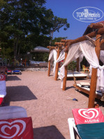 пляж-общественный и платный 2$-в сутки(лежак+матрас),если с утра заплатил,можешь уйти ,вернуться и уже не оплачивать ,до него 15 мин пешком,а вообще курсирует бесплатный автобус 4 раза в день и обратно,расписание висит в холле.пляж большой ,не мелкий ,плавный заход,песчаный,море чистое,прохладное.Хотя пляж и общественный,но лежаков всегда всем хватает,и в море есть где поплавать.