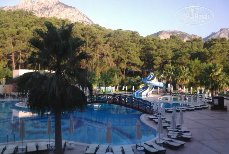 Территория маленькая, один большой бассейн с горками и один детский бассей, территория для детей и в общем- то и всё. Сам отель не старый, персонал бесконечно все метёт, чистит, так же и в столовке. Грязи никакой нет, все чисто и приятно. Есть один минус территории - вечером, когда идет анимация то из-за забора с очистных бывает доносятся запахи. Первую половину дня их нет, а вечером - не каждый день. Так же, что касаемо территории - у отеля прекрасный вид на горы, весьма рекомендую.