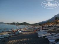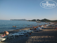До пляжа идти минут 5 неторопливым шагом, есть много отелей первой линии у которых идти по своей территории до пляжа дольше :) Так что вторая линия в данном случае это не проблема. Пляж и заход в море- мелкая галька, спец. обувь не требуется в отличие от соседей. Тут же на соседних пляжах у крутых отелей заход в море крупные булыжники, на которых оставите все ноги. Море чистое, как и везде в Кемере. Ширина пляжа небольшая, но лежаков хватает всем. Лежаки стоят рядами под тентами. Вызывают недоумение наши туристы, которые придя на пляж начинают тащить лежаки впритык к другим туристам так, чтобы их ноги лежали вплотную к лицам других людей. На замечание пожилых людей что бы оставили место, чтобы сдвинуться в тень начинают огрызаться и кричать матом при своих же маленьких детях. И это при том что мест свободных навалом, надо только головой повертеть вокруг. На пляже стоит автомат с соками, типо юпи-инвайт, и бармен наливает пиво, колу, пепси спрайт. Плюс гамбургеры и картошка фри. В общем есть отели с полноценным питанием на пляже, но это не Eldar.