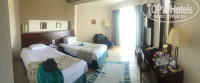 Прилетели мы поздно, поэтому в отеле были около 10 вечера. Естественно без ужина, ибо уже было закрыто все. Только бар открыт. Заселения ждали минут 20-30. Номер дали без денег - отличный, на 2 этаже ближе к морю. Вид на море и бассейн с садом (вообще судя по балконам все номера с таким видом). Один минус - постель в катышках. Спать было неприятно. В номере дают 2 бутылки воды, в которые можно наливать после воду самими из кулеров, которые стоят по всему отелю, в том числе и на этаже с номером. В отеле 2 корпуса, мы были в 1. Во второй обычно селят тех, кто с детьми, поэтому благо крик детей нас не доставал. В отеле круглосуточный бар.