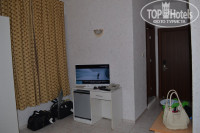В номере две кровати, шкаф, телевизор (плазма) с холодильником, кондиционер, пара тумбочек – минимальный набор только нужной мебели, нет никакого захламления ненужных стульев и табуреток. В ванной свежий ремонт – душевая с унитазом, умывальник с туалетным столиком. Из косметики – две бутылочки шампуня, кусочек мыла.