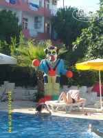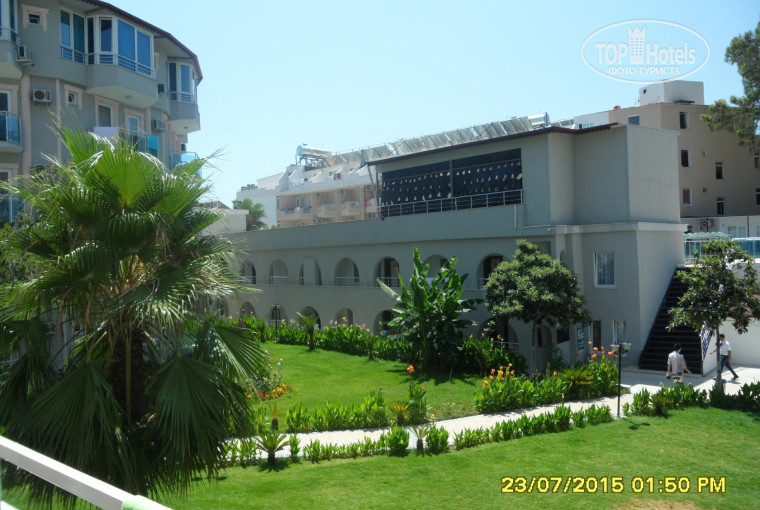 Эта поездка как то отбила у меня желание еще посещать Турцию((( Летали втроем, со свекровью, заселили сразу но номер нам с мужем достался во 2 корпусе где амфитеатр, балкона нет, окна на улицу, 2 ночи не спали толком, кондер еле дышит, свет отрубается просто постоянно, холодильник не охлаждает, окна открыты с улицы шум. Свекровь поселили в 4 корпус, я начитавшись отзывов начала отказываться сразу. Сказали через день нас переселят. Через день подошли к Вейсу и он нас несказанно обрадовал что дает нам номер в 3 корпусе, но сегодня мы должны ночь переночевать все вместе! Я сказала что свекровь в принципе устраивает номер, ее можно оставить. Он сказал нет, ее тоже надо переселить. Расстроились конечно, были убеждены что обманут. Но нет. Назавтра мы уехали на экскурсию, а свекровь переселили в трехместный номер на 3 этаже, над нами. Через переселение проходят все приезжающие в этот отель. Уборка....была. Пепельницы и мусор выбрасывались через раз. Постель не меняли ни разу! Только полотенца. Сейф не брали, из номера ничего не пропадало. Номера чистые, светлые, минус-нет сушилок. Все вешают все вещи на балконах. Очень высокая влажность. Вечером нельзя было сидеть в баре, так как нечем дышать и все течет с тебя, даже волосы влажные. Бар. Все бармены делают ОГРОМНОЕ одолжение, наливая вам напитки, как будто из своего кармана. Наливают по полстакана а когда подходишь за добавкой еще смотрят на тебя как будто ты выпил одним махом литр пива и вернулся взять еще. В общем очень неприятно, муж все время был на взводе. Вино противное и белое и красное. Только раз попалось более-менее. Столовка ужасная. Мухи, много испорченных холодных закусок. Все приходилось по запаху брать. Из горячего все было нормально, голодными не были никогда и даже наоборот. Позабавил БОРЩ с лапшой)))) И все время очереди. И периодически вырубался свет. Официанты светили в тарелки фонариками)))) Вода в кулере на улице, может и правда пишут что из под крана, прошло 2 недели а мы все еще маемся с животами периодически((( Насчет анимации. Шоу каждый вечер, понравилось лото. Остальное-плохой КВН. Пляж грязный, общественный, натянуты тенты, лежаки есть, матрасы ужасные,везде окурки. Сама курю, но под ноги не бросаю, что за свиньи? там везде урны есть. Море очень чистое, прозрачное, видно все камни на дне. Дорожка выложена мешками из камней. в принципе удобно, но на них постоянно сидели местные мамаши с детьми, приходилось обходить.