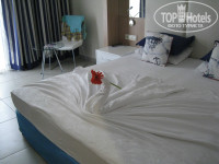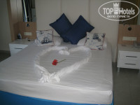 Только что вернулись из отеля, скажу так- остался бы еще, но нужно работать. И так по порядку.:прилетели 6 августа 2015 года, из Домодедово, рейсом компании Катэкавиа(Azur Air) летели от TUI. Вылет был в 14 часов, в отели были в 20 часов, нас сразу отправили на ужин. Вернувшись с ужина, получили карточку от номера, карточкb на полотенца и браслеты. Отдыхали семьей 4 человека, двое взрослых и подростки 14 и 16 лет. Номер нам дали 1116(расшифровка- 1 корпус, 1 этаж, номер 16), оговорюсь у них 1- этаж, это в нашем понимание 2 , потому как в отеле есть 0 этаж, это с балконом на земле. Номер довольно просторный, например больше чем в отелях на Кипре, чем в Crystal Flora Beach Resort 5*. Багаж минут через 5 после прихода в номер, поднял носильщик. Переоделись и пошли изучать территорию. В 21-30 были на концерте которые проходят каждый день( разные постановки- исполнители аниматоры). На завтрак, обед, и ужин ходили к открытию, поэтому в столовой было чисто, скажу что в зале очень душно, поэтому столик брали на улице. Вставал рано в 6-40 и шел занимать места, потому как в 8-9 часов, места у бассейна уже все заняты. В отели наверное процентов 70-75 это скандинавы, поляки, сербы, остальные русскоязычные-русские, украинцы. Питание думаю как и в большинство отелей Турции- мясо, рыба, птица, всевозможные гарниры, салаты, одним словом вкусно, много. Голодным точно не окажется никто. Жене очень нравились пирожные, торты, и прочие сладости. Из фруктов на завтрак, обед и ужин- арбуз, дыня, яблоки, груши, апельсины, сливы, виноград был только на ужин. По дням недели. меняются кухни. Бывают рыбные дни, из 11 дней отдыха их застали 2 раза. На территории огромный бассейн, глубиной 150 см, и есть глубина от 20 см, для детей и еще 2 маленьких детских с горками для самых маленьких. Для детей есть 2 детсада, куда можно сдать ребенка с 10 до 18 часов, один русскоязычный и другой англо-датско-шведско-бельгийско-голландский. Отличные горки, аж дух захватывает для взрослых и подростков, там где-то 9-10 различных горок, как для катания на попе, так и на надувном кругу(круги лежат стопками возле горок). О Пляже- протяженность метров 100, до моря от лежаков метров 30, пляж песочный, заход в море пологий, народа в море мало, купаться удобно никто не мешает. На пляже платные услуги: гидроцикл 45 евро за 15минут, или 35 за 10 минут(можно договорится). Парашют, банан, ватрушка, катание на катере. Территория, отеля большая вся в насаждениях, ухоженная. Кто-то писал, что некуда пойти, да отель расположен на удалении от города. Если пойти по кромке моря в лево от отеля, то через 10-12 минут, дойдете до п. Титрейенгёль. Там улица, с магазинами, где цены ниже чем в отели, и там можно взять на прокат, электро велосипед(7 долларов, 30 минут, и еще какие-то двойные электро велосипеды). Я там покупал и вино, и лукум и сувениры, и наушники для телефона. За сервис поставил 5-, только из-за того, что при выезде гид сказал, что сухпай заказывать не нужно, они сами смотрят и выдадут. Так вот придя на ресепшен в 6-00, и сдав номер, сухпая не получили.....Кто-то написал в отзывах, что предвзятое отношение к русским, так вот увидел обратное, придя утром следующего дня, после приезда, на ресепшен, для заказа сейфа( сейф в номерах платный, как его сделать бес платным могу подсказать, потому что за денежку вам выдадут инструкцию по пользованию) спросил, есть ли русскоговорящий администратор, так как сам английск