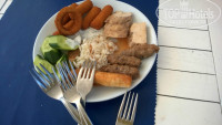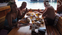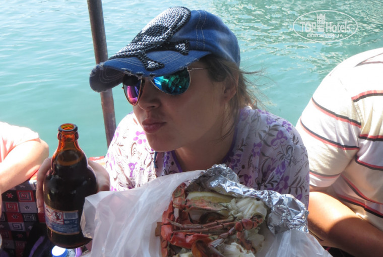 Потом поплыли ловить крабов.Дали каждому по удочке,и все,хоть по одному но поймали))Я в том числе)Пофоткались,выкинули ведрище с крабами,отдали по 20 лир за порцию крабов,и погнали на пляж.На пляже скупнулись,и сразу скрылись в кафэшке,т.к.лежаки и зонтики платно,10 лир(200 руб-4 баксов),а мы уже накупались на эгейских. Похмелились коньячком.(Возьмите с собой свой)Дождались кораблика,дали наши порции крабов,с пивом(за 3$ за бутылку Efes) их слопали,поплыли дальше.Тут сюрприз,кормёжка!(А мы крабов налопались,блин)Неплохая.Не порциями,а шведский стол!Норм,есть чё поесть)).