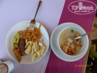 Питание слабовато,но мы любим овощи(кабачки,баклажаны,огурцы,помидоры),несколько раз была курица,раз мясо,скумбрия,полуфабрикаты скорее всего соевые.Белое вино мне не понравилось,пила красное,один раз был шикарный вкус
