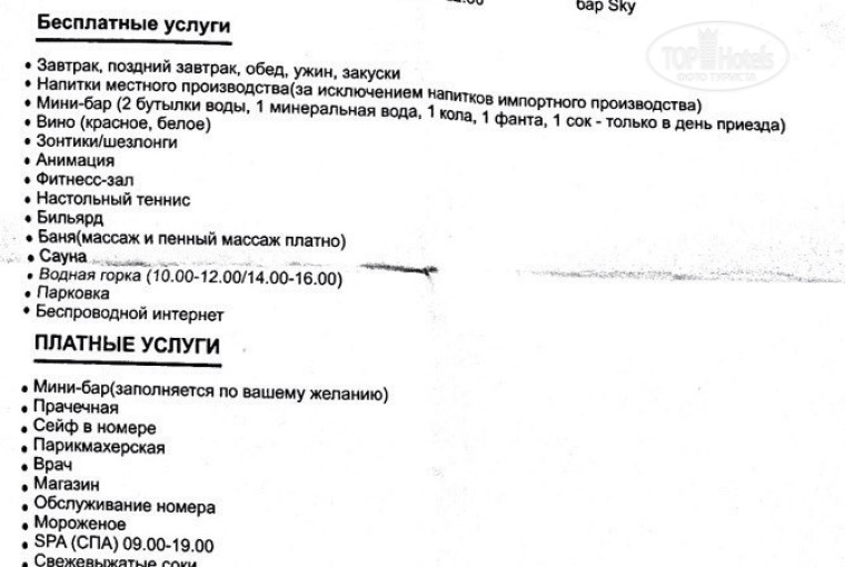 Вместо фото я приложил скан памятки из отеля, открыв его вы узнаете: расписание ресторана, перечень платных и бесплатных услуг.