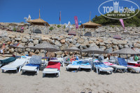 Пляж тоже нормальный и шезлонгов хватает на всех. Как спускаетесь с лестниц, у первых шезлонгов -там дно в море слишком каменистое, если пройти дальше - там дно очень даже хорошее, купаться можно!