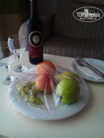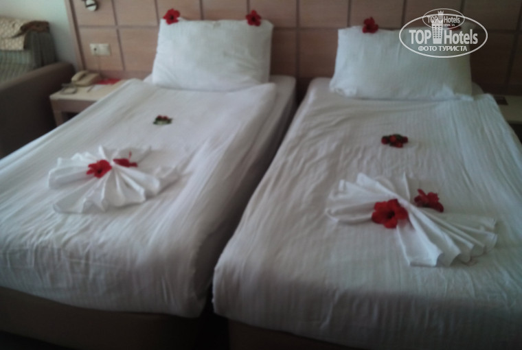 Мебель в номере новая. TV плазма с русскими каналами. Кондиционер работал хорошо. Постельное белье белоснежное. Удивило, что вместо простыни чтобы укрываться были одеяла и 2 подушки разных размеров. Это огромный плюс. В номере убирали хорошо, пол мыли, полотенца меняли каждый день, ванные принадлежности докладывались, но наверное по усмотрению уборщицы, когда и что докладывать. Один раз нам украсили кровати живыми цветами. Через день принесли в номер бутылку вина и фрукты. Было приятно. Мини-бар пополняли каждый день: 2 бутылки воды, 2 бутылки мин.воды, 2 нектара в пакетах (не сока), 1 бутылка пива. Под кровать не заглядывала, пальцем кафель не ковыряла, пыль и плесень не искала. Не с проверкой же мы приехали.