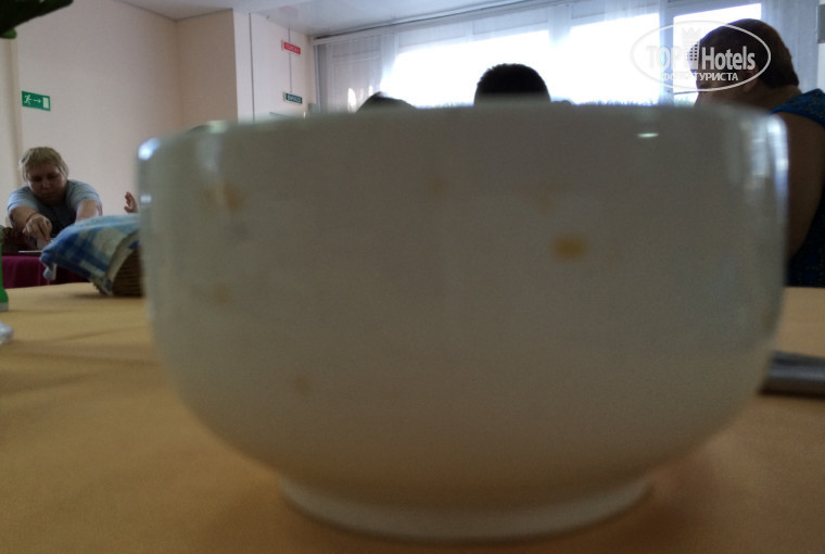 Еда в столовой, в 2 смены. Порции маленькие, еда столовская, утром каша, стандартное масло и 3 кусочка колбасы. Посуда сплошь ГРЯЗНАЯ И БИТАЯ! Очень неприятное ощущение и есть старались с закрытыми глазами.