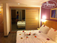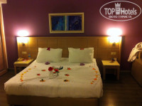 Здравствуйте. Мы ездили впервые в Турцию, очень маленькой молодежной компанией, выбрали этот отель из-за демократических цен (по сравнению с тем, что нам предлагали) и из-за того, что он более имение новый (как нам сказали он открылся в 2015 году) плюс еще еда круглосуточно. Приезжаем мы в отель заселяться (а мы молодожены, и нас должны соответствующе встретить - вино, фрукты, украшение номера, - так у них написано на сайте), на ресепшене говорят, что у них не указано, что мы молодожены (хотя при оформлении поездки в турагенстве, все указывали и при нас лично отправляли, мы своими глазами видели, что было указан этот пункт). Мы чуточку побушевали, в течении часа нам предоставили номер сьют с видом на море (а мы заказывали стандарт двухместный, вообщем в этом плане нам повезло). Но нашему другу не могли предоставить номер... типо у них нет номеров в отеле.. я не могу понять как это нет, если мы бронировали за несколько месяцев.. и вообщем ему предлагают 1 ночь провести в другом отеле..(на выбор дали 2 отеля). Он конечно, чуть переживал, но согласился. В конце-концов, мы пока прошлись по отелю, то посмотрели, то поели, нашему другу нашли номер в нашем отеле и идти никуда не пришлось. В эти моменты было не очень приятно.. Нам молодоженам вино и фрукты принесли в номер, но номер все никак не украшали.. Это была целая проблема для них украсить номер, но я добилась своего! Его 1 раз украсили (лебеди и все дела).. Захотели мы как-то в лякард сходить, мой муж заказывал столик и попросил, чтоб его украсили, сказал, что у нас праздник, все объяснил, но ничего так и не украсили, даже банальной маленькой вазочки с цветами не было..
