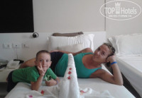 Привет всем!Мы вернулись с этого отеля 25.09.Начну:приехали в 6 утра,заселение положено в 14.00.Мы не стали терять время и пошли в бассейн(их всего 3),чемоданы оставили в холле,как и все.Бассейн просто чудо!Вода теплющая,чистая,сын вообще не хотел вылазить,но с дороги устали и очень хотелось,чтоб нас пораньше заселили,отдохнуть.Подошли к гиду(Анекс-тур),он попросил ребят на рецепшине,чтоб подготовили пораньше номер,и в 11 мы уже были у себя!Сразу пришел уборщик,поставили доп.кровать для ребенка,по моей просьбе принесли утюг с доской(бесплатно!).Кондёр работал,телек тоже,ТНТ с перебоями.Душ нормальный.Единственное,было немного муравьев в туалете.Вид из номера хороший,на бассейн и на детскую площадку(правда площадка слабенькая,почти никакая)Но мы на ней время не проводили.Анимация была очень активная!Парни(Зай и Маду) завлекали всех на зарядку,танцы,конкурсы и пр.Детский клуб тоже есть,там работают девочки Оля и Ксюша.Девочки веселые,добрые,с детьми возятся)в течении дня клуб открыт 2 раза на 2-3 часа,можно ребенка оставить.Вечером для детей в 21.00 диско и конкурсы!и не важно сколько детей-3 или 10-проводят в любом случае!После диско была анимация для взрослых,мы застали конкурс "Мисс отель","Мистер отель", шоу со змеями(круть!!!),музыка очень классная,заводная,манящая на танцпол,аниматоры молодцы!Персонал вежливый,плоховато кто то понимал по-русски,но общий язык находили на ломаном английском) Питание(5раз)-разнообразное:рыба,перепелка,куриный шашлык(оч вкусный),говядина, котлетки типа люля-кебаб (тоже супер),рис,картошка,паста,лазаньи,салатики,овощи,цукини,бобы,на завтрак:амлеты(при тебе делают),блинчики с повидлом (4-6 видов),хлопья,яйца вареные,сосиски жареные(не пробовала),выпечка обалденная,булочки всегда свежие,мягкие,на обед и ужин дополнительно десерты(я с ума сходила от какосового тортика!),фрукты,супчики(не ела),спиртное:вино,пиво,водка,ром,виски,напитки-типа Юпи,газировка,вода.Вода есть в куллерах,можно набирать в бутылки)Еда классная!Шеф-повар и его команда очень приветливые!Улыбнутся всегда тебе в ответ!Голодными не останетесь!Шеф-повар (по-моему имя Хосан)нас накормил в день отъезда,что нам не полагалось!Подошел на рецепшен и сказал менеджеру,чтоб выписали на его имя 3 порции!Это было очень приятно!Он нам очень понравился!!!По поводу территории-поставила бы 4+.В самой гостинице,в туалете и в ресторане уборщики сразу уберут,если кто что уронил,столы тоже сразу освобождают от грязной посуды,работаю быстро!В отеле есть 2 магазинчика на первом этаже,в одном работает Сулейман,мне он понравился,во втором магазине не торгуются вообще(.У Сулеймана можно купить мороженое за 1$, кальян,магнитики,игрушки,серебро,чипсы,мелочь всякую,отлично говорит на русском!).Пляжа 2(один недалеко от отеля,коралловый,2$,а второй, на котором мы обычно загорали-дальше,ехать на автобусе минут 10(автобус от отеля,бесплатно,6 раз в день,этого предостаточно).На пляже бар безалкогольный.Мелкая галька,вода отличная,выход в море тоже,деткам в самый раз!Бармены вежливые,работают быстро!Коктейли мешают классно!поговорят с тобой!Полотенца выдают на бассейне,их можно брать на пляж,хватает всем,лежаков много на бассейне, на пляже их достаточно,но лучше ехать сутра!Все понравилось!Рекомендую!
