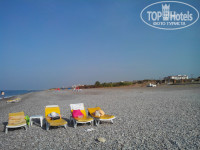 Пляж отеля песочно-галечный не ухоженный шезлонги сломаны, матрасы порваны, два дня был пластмассовый пантон, но его убрали, с левой стороны от пантона было выведена труба, через которую постоянно, что то сливали в море, из-за этого море у берега была не очень чистая вода.