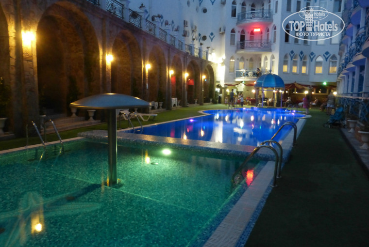 Отель очень хороший - небольшой, уютный, домашний. И что ценно в наше время - с охраной на въезде-выезде. Правда интересный вопрос кого от кого охраняют: нас от постороннего вмешательства или от нас проезжающих, проходящих (мимо отеля проходит единственная дорога в правительственный дворец князя Юсупова).? Территория - небольшой дворик с бассейном.