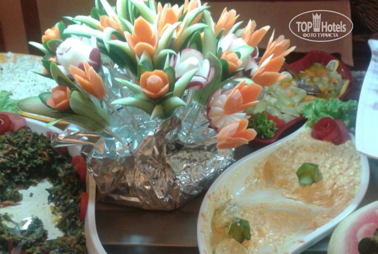 Ресторан. На завтрак стабильно одна рисовая молочная каша. Несколько видов сыра, колбас, оливки, зелень. Различные виды хлеба булочек. Из фруктов чт-нибудь. Чай кофе молоко. Можно делать тосты. Яйца омлет или сосиски. Плюс обязательно на гриле что нибудь делают- омлет, оладушки, блинчики. На обед и ужин обязательно один вид супа. Два мясных блюда -курица или индейка в основном, иногда была баранина и говядина, рыба. Плюс гарниров горячих 4 лотка. Куча свежих овощей. Салатов майонезных. Стол десертов. И стол фруктов. Из фруктов давали арбузы яблоки персики сливы виноград черный и белый груши. Груши и сливы были немного недозрелыми, но при этом все равно сладким и вкусными. Перед отъездом стали давать ещё зеленые мандарины, кисло-сладкие. Всегда также что- то делали на гриле. Рыбу курицу котлеты. Там же пицца была. Вообще никогда голодными не уходили. Всегда было что выбрать. И для маленького ребёнка в том числе. Отварные овощи, пюре картофельное. Курица индейка готовились так, что мясо буквально на волокна распадалось, ребёнок ел спокойно. В ресторане штук 7-8 детских стульчиков. Во. Их иногда не хватало, если прийти не к началу. Поскольку деток в отеле очень много, поэтому спрос на стульчики всегда был). С 3 до 4 давали гамбургеры и картофель фри. С 4 до 5 печенье и кексы на террасе. Официанты (кто то жаловался что они полумёртвые ходят) нормально абсолютно работают. Убирают как только появляется грязная посуда. Ни разу её видела чтоб стряхивали крошки со стола в посетителей, как это читала в отзывах. Скатерти меняют регулярно. Да пятна иногда были, особенно если прийти не к началу, а к концу. Уж как ел мой ребёнок поросёнок - Так скатерти приходилось менять каждый день. И меняли. Да возможно на обед и ужин будет ещё старая скатерть с пятнами после завтрака, но на следующий день уже лежали чистые свежие. Ни разу не встретила грызне ножи и вилки. Пару раз видела непромытые тарелки и чашки. Но в принципе все чисто в ресторане. Блюда меняют как только они заканчиваются. Везде стоят люди, которые следят за этим и сразу приносят новые порции.