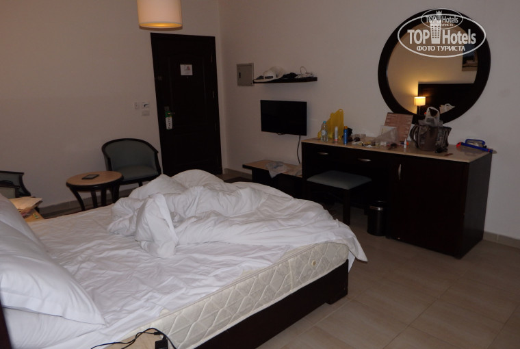 Главным критерием выбора отеля была близость к Эль-Гуне, так как давно хотелось посмотреть на "Египетскую Венецию", а цена отелей в самой Эль-Гуне гораздо выше, чем в среднем по Египту. Из этого отеля до Эль-Гуны - 10$ на такси туда-обратно (заказывается прямо в отеле рядом с рецепшн; ездили 2 раза). Также за 10$ можно съездить в центр Хургады. Больше выйти погулять некуда. Через дорогу от главного входа - пустыня. Магазины только при отеле: пара сувенирных лавок со стандартными чашками и магнитами, чаи-специи-фрукты, аптека, ювелирка, арома-масла. За счет того, что корпуса отеля вытянуты перпендикулярно морю, создается достаточно большая территория, чтобы обойти круг потребуется минут 10-15. На территории ярко, зелено, цветут цветы, но создалось впечатление, что отель еще не до конца построен или не полностью заселен, многие корпуса пустуют. Странный лифт (проживали в корпусе 21), в котором надо самим открывать дверь (как в старых-старых советских), тоже не делает плюс якобы новому современному отелю. При поездке на лифте видны ничем не заделанные бетонные перекрытия между этажами. Ресторан на пляже не работает, работает только ресторан у бассейна и главный ресторан (столовая). Баров открыто много. Алкоголь не пили, поэтому о качестве судить не могу. Еда немного однообразная, но все что надо есть - выпечка и сладости, овощи свежие и жареные, яйца, рис, макароны, картошка, курица, рыба или говядина. Чай в пакетиках только черный. И еда качественная - не травились, никаких проблем с желудком не было. Но ГЛАВНЫЙ недостаток ВСЕХ баров и ресторанов на территории - ГРЯЗНАЯ, БИТАЯ ПОСУДА!!! В номерах же все неплохо - современный дизайн, плоский ТВ с возможностью просматривать фильмы на флешке, много русских каналов. Убирались каждый день. Из минусов - отсутствие бесплатного Wi-Fi даже в лобби ёи дорогой платный (2$ за час). Во всех отелях 5* уже есть бесплатный интернет хотя бы в лобби.