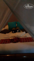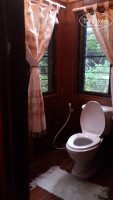 Все выдержанно в стиле экзотики и домиков на дереве. Но есть и все необходимое: мини-холодильник,вентилятор,горячая вода. Особенно радовала москитная сетка на кровати и огромный гамак на веранде. Плюс - на веранде еще стоял столик и скамейки - можно было спокойно расположиться и не спеша позавтракать у себя. Видели стоящую в стороне огромную виллу на здоровых сваях - там, наверное, классно селиться целой компанией.
