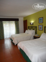 Номер: Номер у меня в путевке был Стандарт без особого вида, оказался на первом этаже. Присутствовал огороженный балкончик, на котором стояли пластмассовый стол, два стула и в стену вмонтирована раскладывающаяся сушилка. Вид из номера мне очень понравился – водоем с фонтанами, пальмами белым деревянным мостиком, где вечерком еще и бродили павлины. В этой части территории и днем и вечером довольно тихо: вечером не слышно анимации, днем музыки из ресторана. Все это мне очень подходило. Сам номер довольно просторный, с двумя двуспальными кроватями с высокой периной и четырьмя подушками на каждой. Утопала в ней как в облаках))) Мебель и оборудование не новое, но все чисто и аккуратно. В номере были: утюг, гладильная доска, сейф с электронным замком (бесплатный), телевизор, кофеварка, фен – все исправно работало. Кондиционер был замурован в стене, пульта к нему не было, регулировался вручную, потолочный вентилятор отсутствовал, да и собственно не был нужен. Оставляла его работающим на весь день, а на ночь просто выключала, и хватало поспать до утра в прохладе. Но хоть и холодил хорошо, но сильно шумел, и если ночью я свой выключала, то прекрасно слышала, как работают соседские) Кстати, стенки довольно тонкие, и если вам попадутся шумные соседи, то вы будете в курсе всего. Мои такие соседи благо съехали на второй день и все остальные дни никого не было слышно. Есть минибар с двумя полторашками чистой воды, маленькими бутылочками Колы и спрайта, обновляли его по мере опустошения бутылок) Холодильничек, хоть и старенький, но работал довольно эффективно, все охлаждалось в кратчайшие сроки. В ванной комнате был душ с огромной круглой лейкой (по возвращении домой наши российские просто показались мизерными))) в которой регулировался напор и ванна. Горячая вода всегда была с хорошим напором (наверное, потому что этаж у меня первый), надо было только слить воду в течение 2-3 минут. Хотя другие туристы жаловались на встрече гиду, что вода у них отсутствовала, гид переписала все номера комнат и думаю, вопрос этот решился, т.к. девушка была ответственная. Сантехника была в хорошем состоянии, исправно работала, нигде ничего не протекало. Прикольной оказалось конструкция унитаза, в широкой чаше которого постоянно плескалось 4-5 литров воды и при нажатии кнопки спуска, вода угрожающе поднималась к ее краям и казалось, что вот-вот польется через край))) но ничего такого не случалось. Розетки здесь американские с заземлением, похожи на перепуганный смайлик))) для нее еще в России купила переходник, и телефон и фотоаппарат заряжались без проблем. Напряжение в сети 100В и при использовании утюга, чуть было не прожгла себе блузку, т.к. думала, что он будет долго греться и включила его погорячее. Ничего подобного - утюг нагрелся до максимума за секунды)) Горничная заглядывала в номер ежедневно (оставляла ей по доллару), меняла полотенца по мере их загрязнения даже если я не бросала их на пол, мыла полы, вытирала пыль, мыла в ванной комнате. Все было чистенько и аккуратненько. Комнаты горничные начинают убирать чуть ли не с утра, а заканчивают вечером. Т.к. видела тележку около номеров и в 8-9 часов утра, а мой номер убирали и в 5 вечера и даже после 6, но саму горничную не видела, ни разу) Wi-fi в отеле платный: 1 день -10 баксов, 3 дня- 20 баксов, неделя- 30 баксов, покупала последний, на пляже 