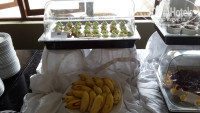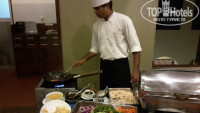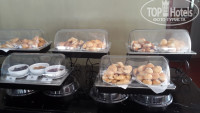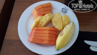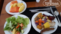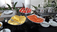 Завтрак. Жарили омлеты с разными наполнителями, блинчики с разнообразными подливками, сосиски куриные нормальные, бекон. Овощи - помидоры, огурцы, салат, тёртая морковь. Ветчина, сыр по одному виду. Фрукты: бананы, папайа, ананас, арбуз, маракуйя и еще один фрукт звездочками (на фото видно). Ну и смеси из овощей с заправками всякими - но мы не едим это, поэтому на вкус не знаю как. Один вид йогурта (иногда сладкий иногда не сладкий). Одна каша молочная. Пару-тройку джемов. Много разных булочек. И в автоматаж свежевыжатые соки, в том числе из экхотического фрукта – Древесное яюлоко