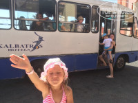 От отеля минут 10 - 15 спокойным шагом , или на бричке ( автобус) их два ,ходят часто с 8 утра до 17 , утром мы после завтрака шли пешком , в обед возвращались на бричке , нас устраивало .